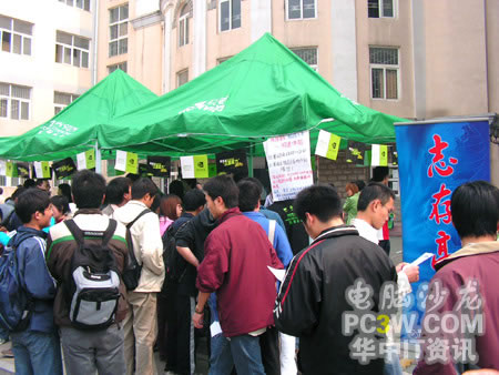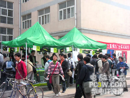 本次華中科技大學站的巡回展示設在人氣相對較旺的華科東區韻苑學生公寓內,整個演示區基本上沿襲了前兩站的風格,分為產品展示區及現場演示區。作為一所理工科為主的學校,這樣的展示自然吸引了不少同學駐足圍觀,一大早展臺還在緊張的布置之中,就有不少同學前來觀展及體驗。