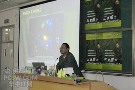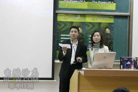 講座首先由商科集團武漢分公司天行電腦的唐平安先生發言,他首先詳細的向大家解釋了銘瑄NVIDIA“三重威力”的定義。并就“三重威力”的具體內容SM3.0、HDR以及SLI逐一做了詳細的說明,并分析了未來顯卡的發展趨勢。他生動詳細的演講讓在場的同學們聽得聚精會神,對其產品有著濃厚的興趣。
