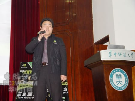 講座首先由商科集團武漢分公司天行電腦的甘松先生發言,他首先詳細的向大家解釋了銘瑄NVIDIA“三重威力”的定義。并就“三重威力”的具體內容SM3.0、HDR以及SLI逐一做了詳細的說明。他生動幽默的演講引來同學們的陣陣掌聲,會場氣氛相當融洽。
