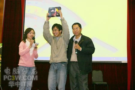 今天的第一個大獎馬上就要被抽出了,獎品為商科集團武漢天行電腦提供的臺電MP3一個?吹竭@個精美的MP3同學們都興奮起來了! 第一位中獎的是位漂亮MM,這位中獎的MM很大方,在觀眾的要求下為大家獻上了一首范曉萱的歌,并邀請了臺下一位GG伴舞,看來華師GGMM們多才多藝可不是吹出來的哦!