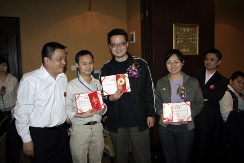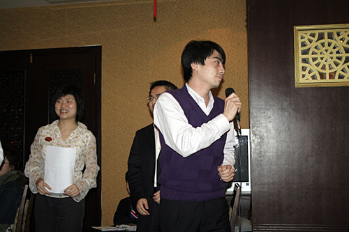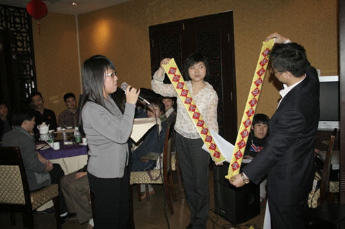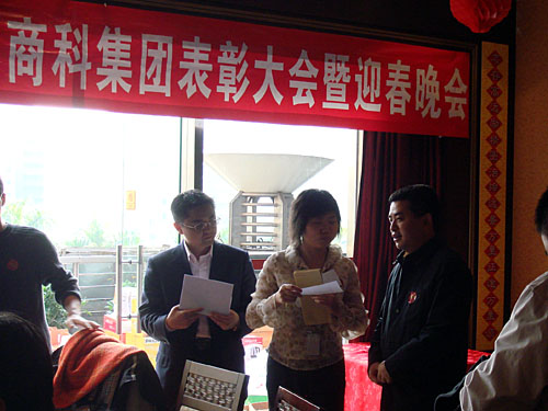 晚會開始前商科集團(tuán)領(lǐng)導(dǎo)對本年度表現(xiàn)優(yōu)秀的員工進(jìn)行了嘉獎和表彰他們是:第四季度部門之星:技術(shù)部 :敖亞軍、業(yè)務(wù)部:吳翠、市場部:臧永剛,第四季商科標(biāo)兵:財務(wù)部:羅春菊,第四季度銷售標(biāo)兵 :田勇,2006年度杰出員工:馮燕蘭,優(yōu)秀職能經(jīng)理 :楊毅,優(yōu)秀經(jīng)理 : 邵清泉