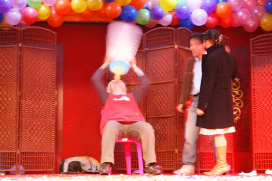 在精彩的文藝節目表演完后,是游戲時間了,首先是搞笑的頂氣球。