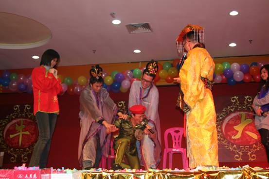 接下來仍然是小品:《荊軻刺秦王》,同事們被詼諧的表演逗的哄堂大笑。