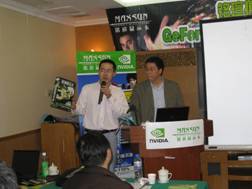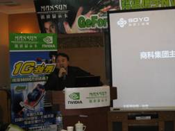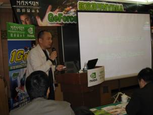 NV廣州區銷售經理楊成發表講話,楊先生用極富感染力的演講方式向經銷商家講述NV專業顯卡QuadroNVCUDA技術,及產品的規劃、性能特點以及市場優勢。