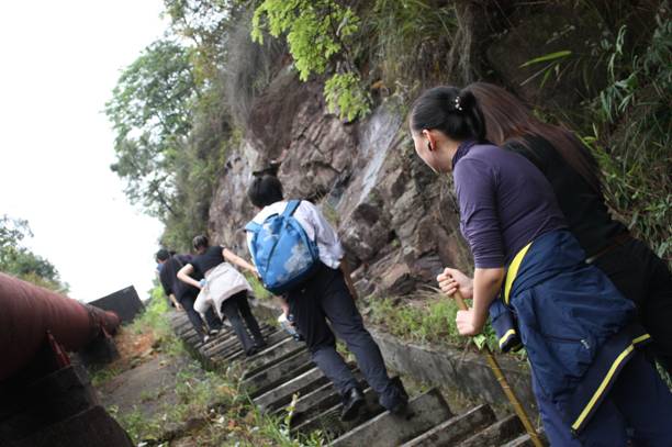 簡單的午餐后,兄弟姐妹們開始攀登白水寨天南第一梯" 9999級石級,當然不免俗的要在“天下第一梯”前面來張大合照,這個時候的我們一個個都精神奕奕的,嘿嘿!