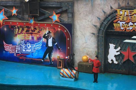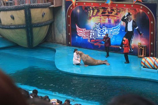 先是海獅表演,接下來是海象表演有熱身運(yùn)動(dòng)仰臥起坐,接著模仿MJ,重頭戲調(diào)戲美女