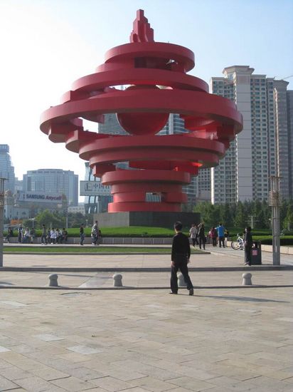 標(biāo)志性雕塑“五月的風(fēng)”,以螺旋上升的風(fēng)的造型和火紅的色彩,充分體現(xiàn)了“五四運(yùn)動(dòng)”反帝、反封建的愛國主義基調(diào)和張揚(yáng)騰升的民族力量。