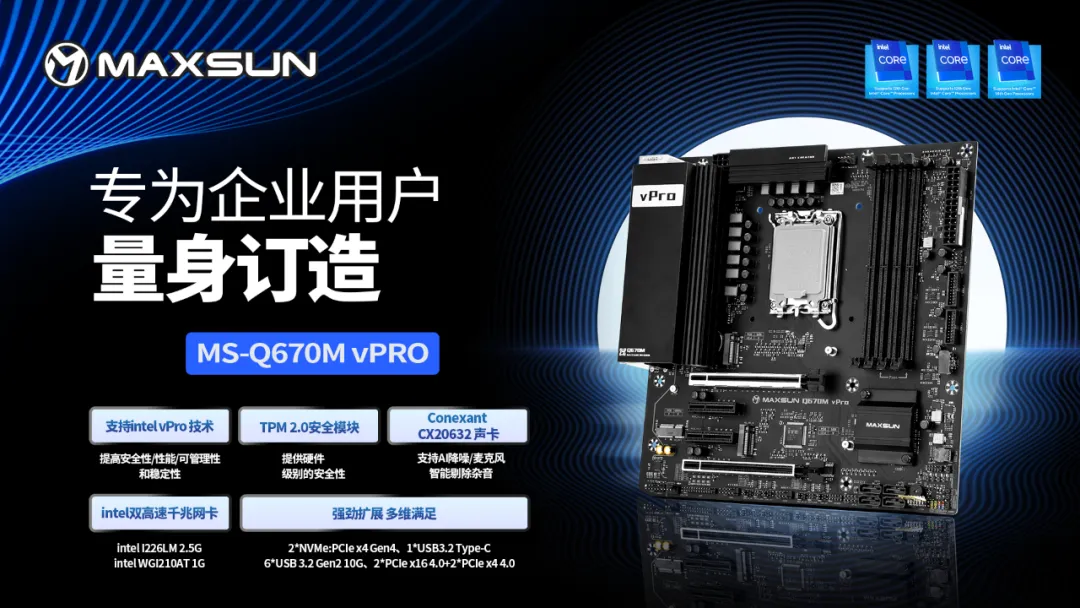 專為企業用戶量身訂造的Q系列vPro主板——MS-Q670M vPRO,搭配Q670芯片組,支持intel12/13/14代CPU;強勁擴展,支持13個USB接口(6*USB3.2Gen2 10G+1*USB3.2 Type-C+2*USB3.2 Gen1+4*USB2.0);支持1*Pcie 5.0x16+1*Pcie 4.0x4(x16 slot)+1*Pcie 4.0 x4+1*Pcie 3.0;搭配intel 雙高速千兆網卡,支持雙M.2 NVME,多顯示方案,雙HDMI+雙DP。