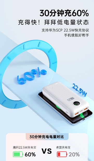 值得一提的是,魔閃20充電寶針對不同設(shè)備進行了深度優(yōu)化。支持華為手機22.5W超級快充,半小時充60%的電量讓華為用戶能夠快速為設(shè)備恢復(fù)電量,大大節(jié)省了充電時間。對于蘋果15-16系列手機用戶來說,魔閃20同樣表現(xiàn)出色,支持PD20W快充,半小時續(xù)航50%,能夠為蘋果設(shè)備提供高效、穩(wěn)定的充電體驗。
