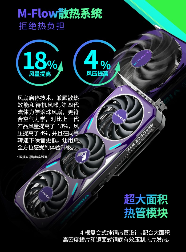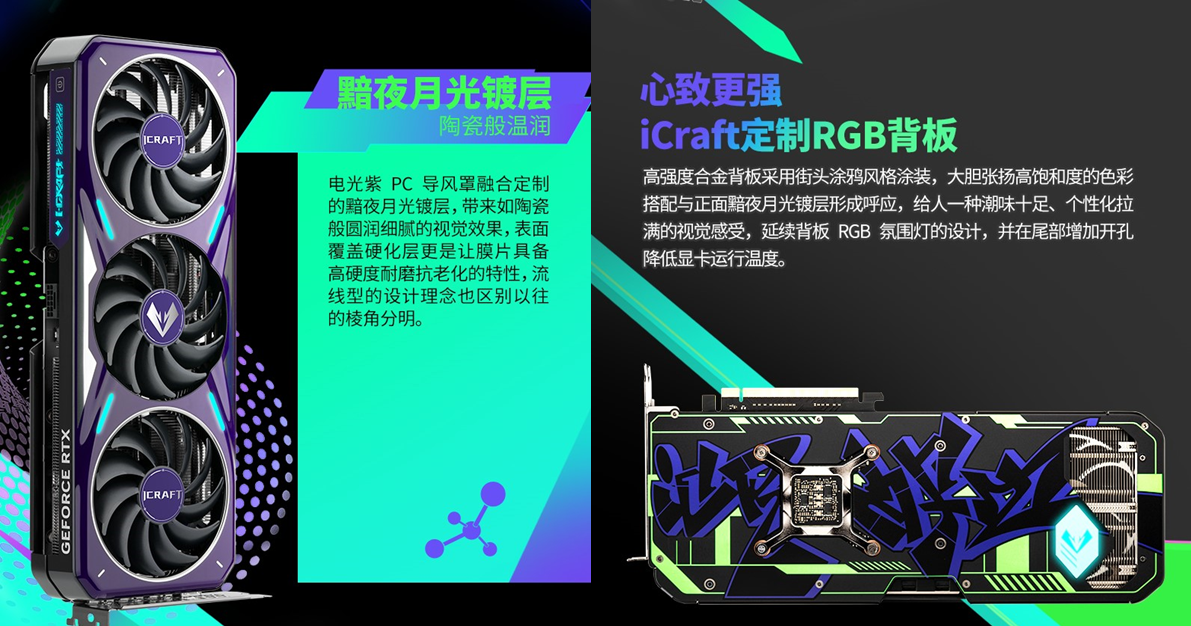 外觀上,這款顯卡潮味十足,打破了傳統顯卡棱角分明的刻板印象。電光紫 PC 導風罩與定制黯夜月光鍍層巧妙融合,呈現出陶瓷般圓潤細膩的質感,表面覆蓋的硬化層不僅讓顏值更持久,更賦予了膜片高硬度、耐磨、抗老化的實用屬性。流線型的設計理念讓顯卡整體更顯靈動,而高強度合金背板則暗藏巧思 —— 街頭涂鴉風格的涂裝大膽張揚,高飽和度的色彩與正面的黯夜月光鍍層形成鮮明呼應,個性化直接拉滿。更貼心的是,背板延續了 RGB 氛圍燈設計,還在尾部增加了散熱開孔,既讓燈光效果更具層次感,又能輔助散熱,做到 “顏值與實力并存”。