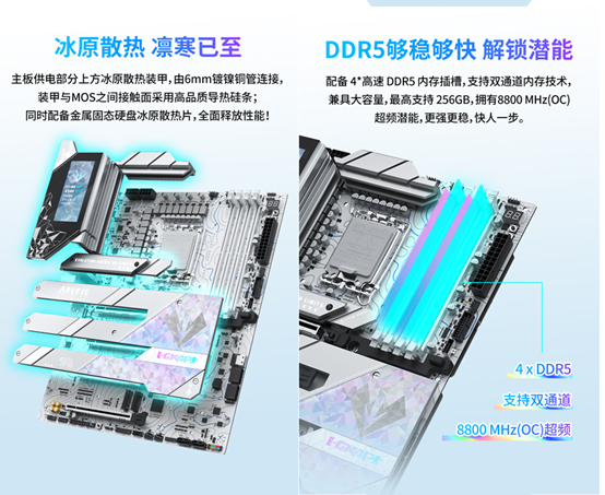 性能方面,這款主板采用16+1+1 相 DR.MOS 供電搭配 8 層服務(wù)器級(jí) PCB,實(shí)現(xiàn)高性能與低損耗的完美平衡,能充分釋放酷睿Ultra 200S系列處理器的性能。散熱設(shè)計(jì)同樣拉滿,供電部分上方的冰原散熱裝甲由6mm鍍鎳銅管連接,裝甲與MOS之間的接觸面采用高品質(zhì)導(dǎo)熱硅條;同時(shí)配備金屬固態(tài)硬盤冰原散熱片,全面保障硬件冷靜運(yùn)行,性能持續(xù)在線不 “掉鏈”。內(nèi)存與擴(kuò)展能力也十分出色。它配備4條高速DDR5內(nèi)存插槽,支持雙通道內(nèi)存技術(shù),最高支持256GB容量,還擁有8800MHz (OC)超頻潛能,搭配CUDIMM內(nèi)存可輕松突破頻率上限,讓《戰(zhàn)地6》的游戲紋理加載速度大幅提升,進(jìn)入戰(zhàn)場(chǎng)更快一步。