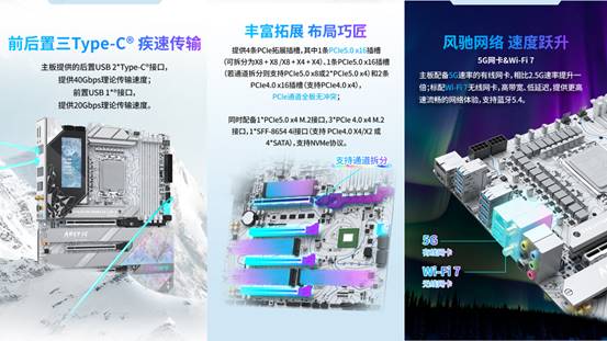 擴(kuò)展方面,該主板提供4條PCle拓展插槽,其中1條PCIe 5.0 x16插槽支持靈活拆分,可根據(jù)需求調(diào)整為X8+X8 或 X8+X4+X4模式,滿足同時(shí)搭載高性能顯卡與PCIe擴(kuò)展卡的需求;板載的SFF-8654 4i接口,可靈活擴(kuò)展為PCIe 4.0 x4通道或4個(gè) SATA 接口,適配多設(shè)備存儲(chǔ)方案。I/O區(qū)域的兩個(gè)40Gbps速率USB4 Type-C 接口,配合DP 1.4與HDMI 2.1視頻接口,輕松滿足多設(shè)備連接需求。網(wǎng)絡(luò)體驗(yàn)同樣無(wú)需擔(dān)憂。它搭載 Intel BE200 無(wú)線網(wǎng)卡與 Realtek RTL8126 有線網(wǎng)卡,支持 Wi-Fi 7 與 5G 有線網(wǎng)絡(luò),還具備藍(lán)牙 5.4 功能。無(wú)論是在復(fù)雜網(wǎng)絡(luò)環(huán)境下進(jìn)行 128 人聯(lián)機(jī)對(duì)戰(zhàn),還是連接無(wú)線外設(shè),都能實(shí)現(xiàn)低延遲、高穩(wěn)定的傳輸,讓你避免因網(wǎng)絡(luò)波動(dòng)錯(cuò)失戰(zhàn)機(jī)。
