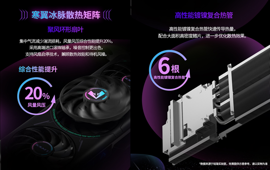 強悍性能的背后,離不開冷靜可靠的散熱保障。銘瑄為這款顯卡量身打造了寒翼冰脈散熱矩陣,聚風環形扇葉能集中氣流、減少湍流損耗,風量風壓綜合性能提升 20%,搭配高端進口滾珠軸承,噪音控制更為出色;高性能鍍鎳復合熱管快速傳導熱量,搭配大面積高密度鰭片,進一步優化散熱效果。配合風扇啟停技術,低負載時風扇休眠靜音省電,高負載時即刻滿負荷運轉強效散熱,即便在《惡意不息》四人聯機長時間鏖戰的高負載場景下,也能保持穩定運行,性能不打折。