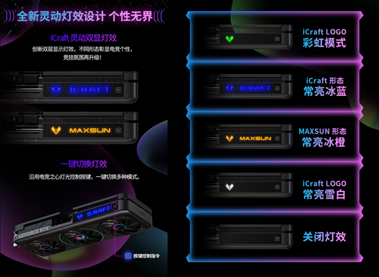 全新 iCraft 靈動雙顯燈效更是點睛之筆,多種燈光形態可自由切換,搭配一鍵模式切換功能,能打造專屬電競氛圍,讓你的主機在眾多裝備中脫穎而出,成為全場焦點。接口方面,DP*3+HDMI 的全接口組合,支持多顯示器連接,輕松滿足不同顯示設備的使用需求,無論是游戲對戰還是日常辦公,都能無縫適配。