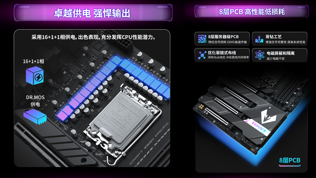 性能方面,這款主板更是實力強(qiáng)勁。16+1+1相 DR.MOS 供電,能充分釋放英特爾酷睿Ultra 7 265K處理器的全部潛能 —— 即便在游戲滿負(fù)載對戰(zhàn)場景下,也能確保處理器穩(wěn)定輸出,拒絕掉幀卡頓。搭配8 層服務(wù)器級低損耗 PCB 與背鉆工藝,優(yōu)化的菊鏈?zhǔn)讲季能消除 Stub 效應(yīng),電磁屏蔽和隔離設(shè)計則減少了電磁干擾,有效降低信號損耗、增強(qiáng)信號完整性。這不僅為供電穩(wěn)定性保駕護(hù)航,也為后續(xù)內(nèi)存高頻超頻、數(shù)據(jù)高速傳輸打下堅實基礎(chǔ)。