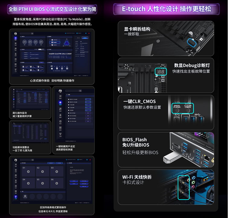 主板貼心的設(shè)計,更是讓裝機(jī)和使用體驗直接拉滿。全新升級的PTM UI BIOS,借鑒手機(jī) APP 的交互邏輯,采用模塊化設(shè)計,交互層級不超過 2 層,手機(jī)端風(fēng)格的卡片式界面,讓復(fù)雜的 BIOS 設(shè)置變得簡單易懂,即使是新手玩家也能輕松上手。顯卡瞬拆結(jié)構(gòu)一按即取,不用費力擰螺絲;分布式 Debug 診斷燈能快速定位故障,小白也能輕松排查問題;CLR_CMOS 快捷按鈕、BIOS_Flash 免 U 升級、Wi-Fi 天線快拆等設(shè)計,全程省心省力。
